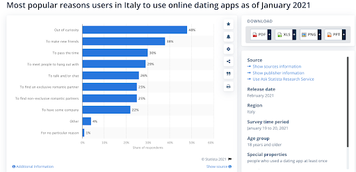 Статистическое агентство Statista.com опросило пользователей в январе 2021 года. Результаты говорят, что итальянцы используют приложения для знакомств из следующих побуждений: